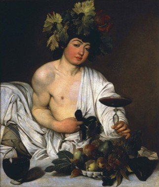 Caravaggio pinta a este personaje de una manera realista de una apariencia cansada, sugiriendo los excesos del vino y la fiesta, mostrandose sentado, vestido con una túnica blanca y una corona de hojas de vid en la cabeza, como simbolo del vino, sus mejillas ruborizadas, uñas sucias y sosteniendo una copa de vino en una manoy en la otra frutas, y con una mirada es directa, desafiante, mostrandose en una postura relajada pero no muy natural.