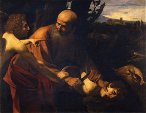 Viendo la obra de Caravaggio notamos un hecho que lo es inexistente en la versión bíblica, pero es el que le da verdadero dramatismo a la escena que es mostrar al Ángel tomando la mano de Abraham en el momento en que estaba por llevar adelante el sacrificio y deteniéndolo.